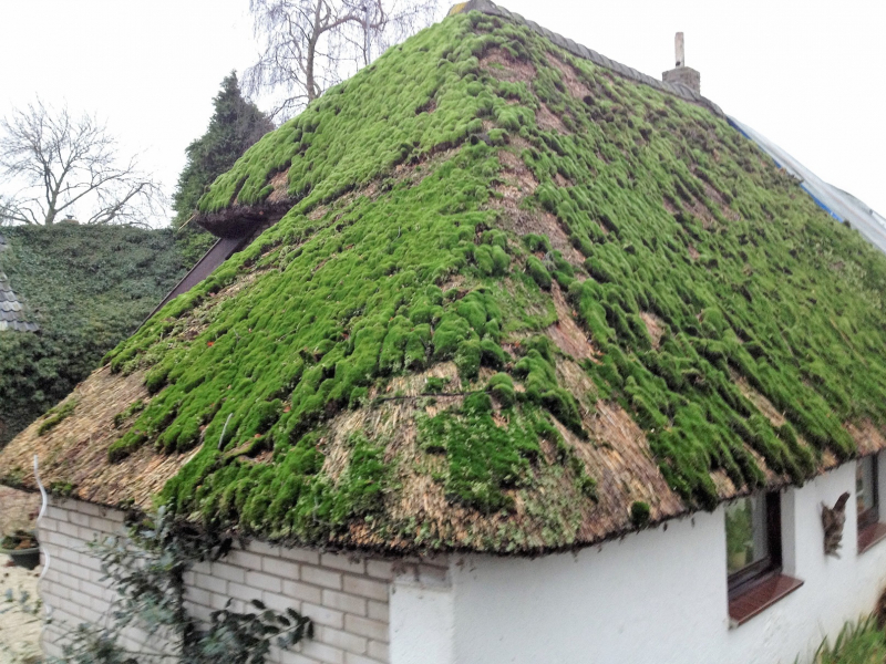 Een zwaar bealgd dak heeft een te lange droogtijd. Het moet al een aantal dagen echt droog zijn (zonder dauw 's nachts) voordat het buitenoppervlak droog wordt. De alglaag krimpt tijdens het drogen. Er vormen zich scholletjes alg die ook de toplaag van het riet open trekken. Valt er nu een bui dan zal het regenwater zeer diep in het riet doordringen. De algen nemen in de regen weer vocht op. Het oppervlak sluit zich. Het dak is zeer diep nat, heeft nu een extreem lange droogtijd en zal zeer snel verder achteruit gaan. 1 jaar in deze staat en het dak kan tot de gaarde (10 tot 15 cm riet) verspochten zijn. Het is zelfs de vraag of de daken nog te redden zijn. In dit geval had het dak dus twee jaar eerder geschoond moeten worden.