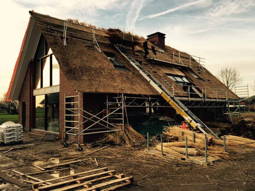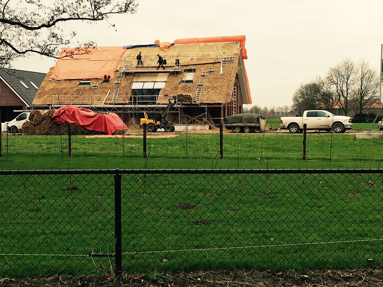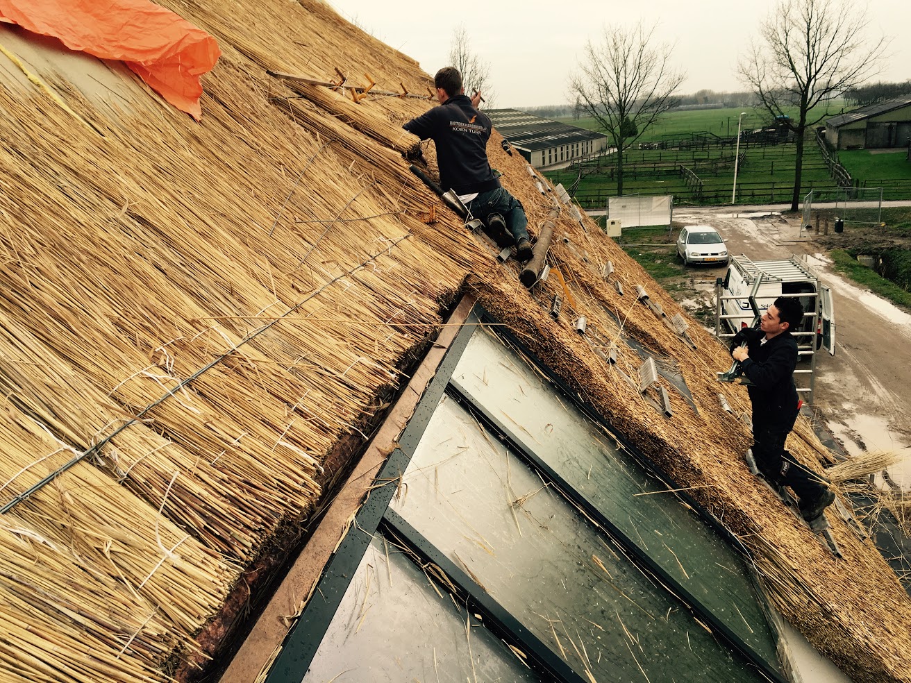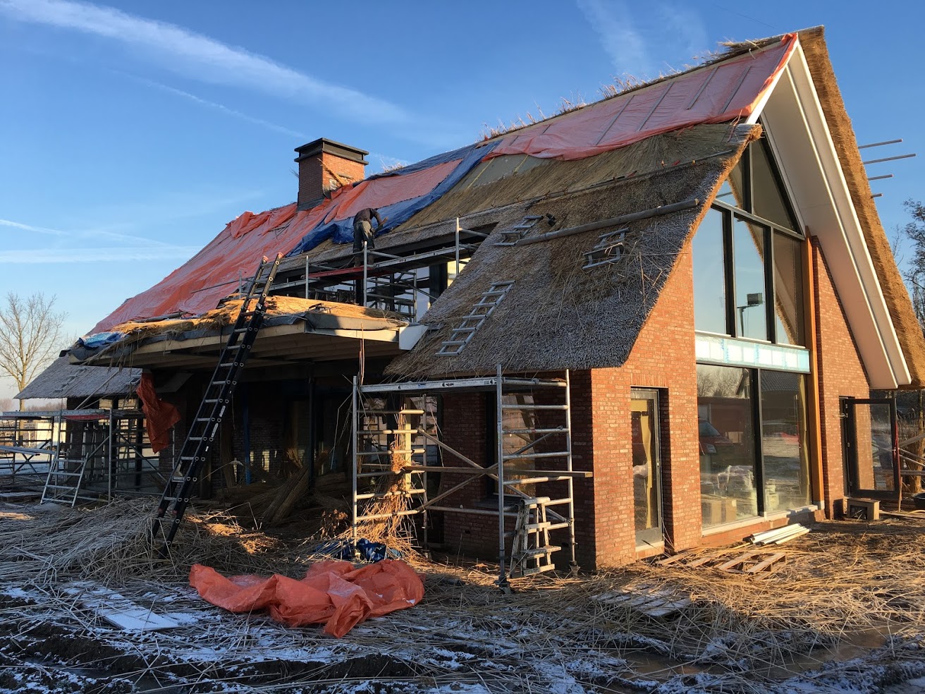 Bij deze Schuur woning in Elst (Gelderland) is een hoogwaardige rieten dak aangebracht. de lichtstraten zijn strak ingedekt.