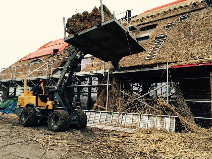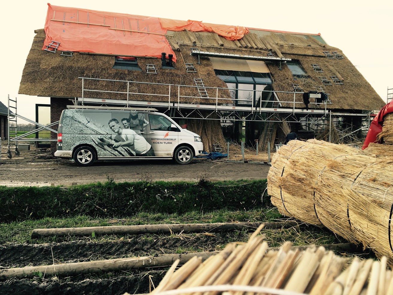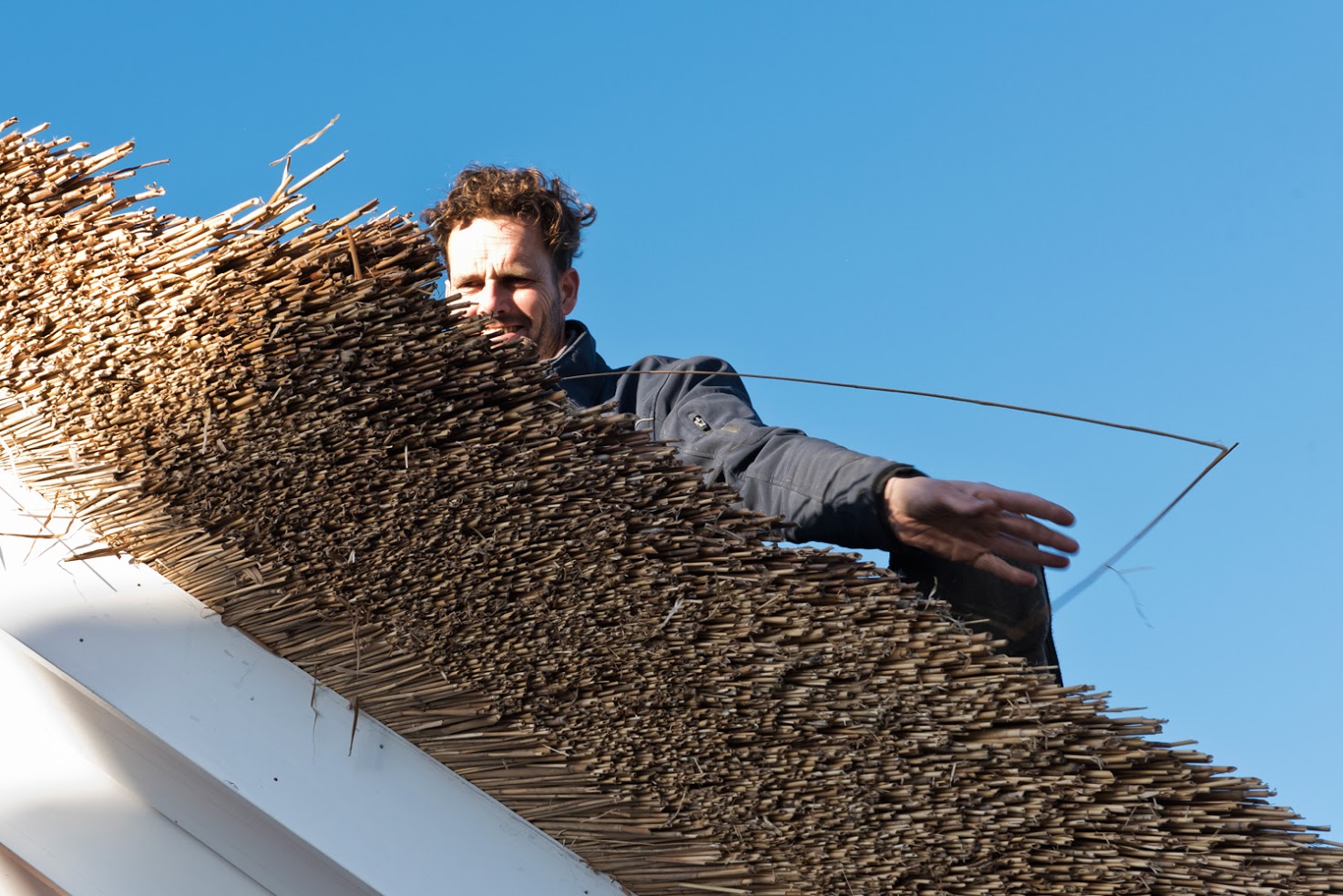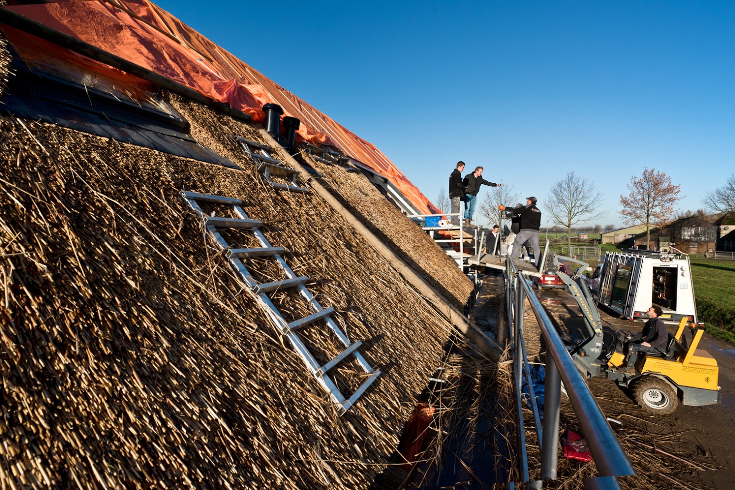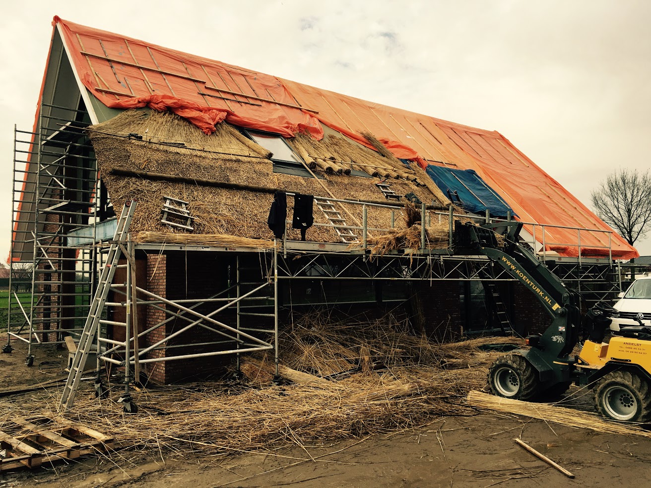 Bij deze Schuur woning in Elst (Gelderland) is een hoogwaardige rieten dak aangebracht. de lichtstraten zijn strak ingedekt.